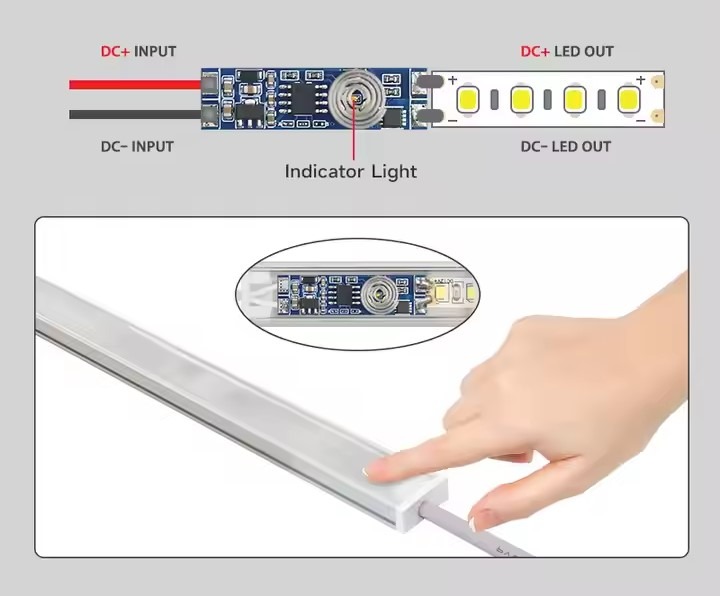 Stikalo je izrezno majhnih dimenzij in je primerno za vgradnjo v aluminijaste profile. Z dotikom pokrova kjer je nameščeno stikalo aktivira delovanje LED traku. Ob vklopu se LED trak postopoma v 3 sekundah prižge in ob izklopu tudi postopoma izključi.Ima tudi funkcijo DIMM.